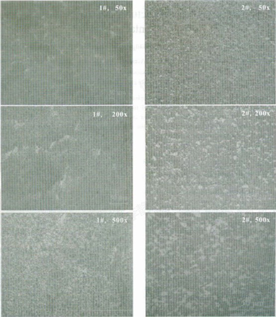 Français On peut voir sur les images 50x que l'échantillon 1 présente une structure métallographique non homogène, dans laquelle la microstructure globale est divisée en plusieurs zones par la « bordure » d'agglomération d'argent, tandis que l'échantillon 2 présente une structure métallographique uniforme sans aucune zone divisée.